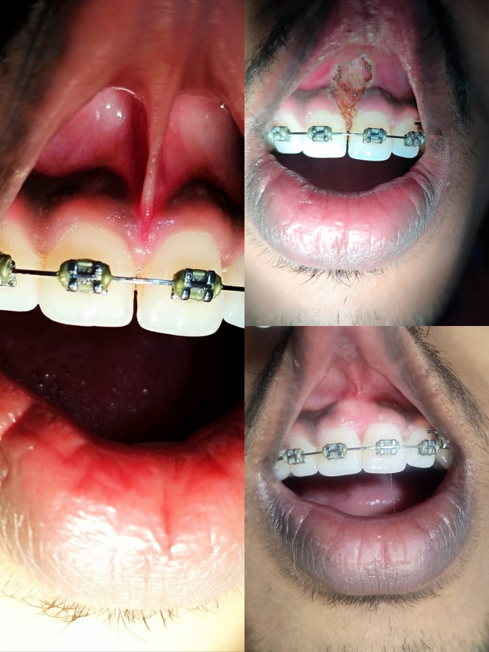 Correction of a highly attached maxillary labial frenum using diode laser.. Before, during and 1 month post treatment.